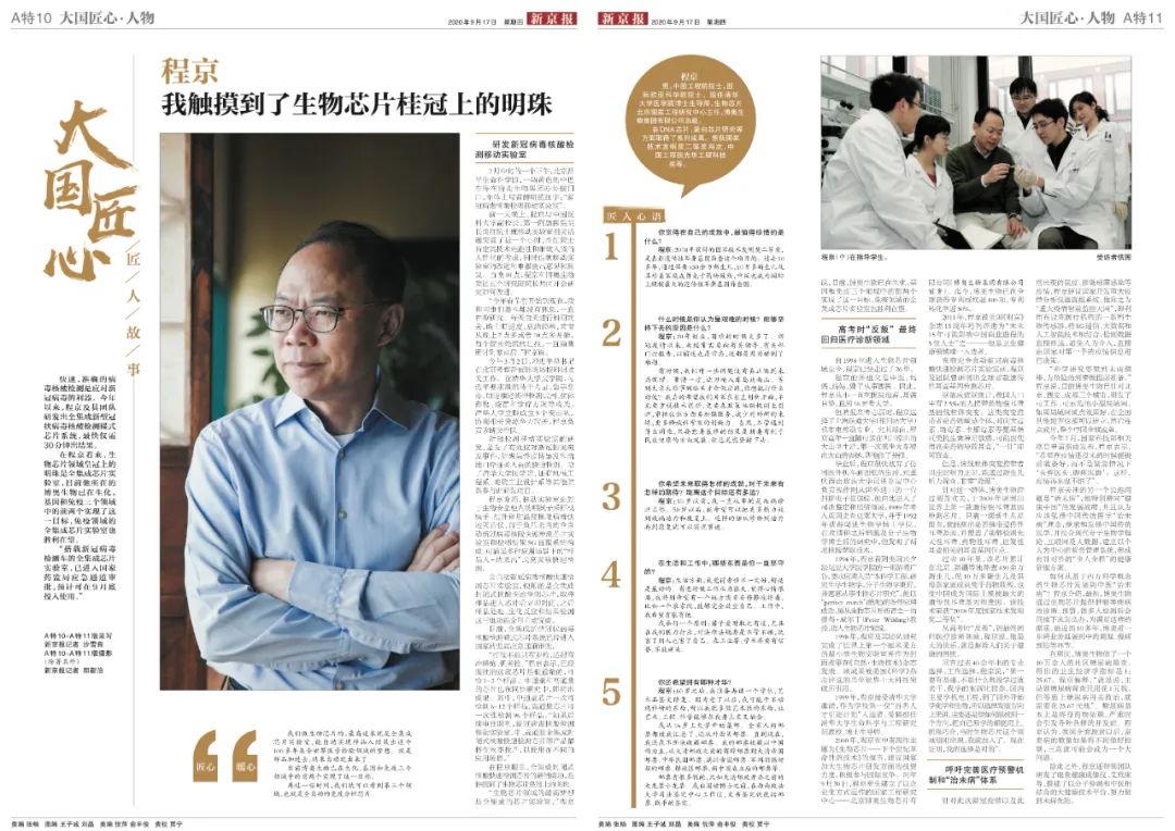 各方凝聚起的“工匠”精神赋予我们跨越山海的底气。9月17日,新京报推出2020“大国匠心”致敬特刊,其中《匠心·聚力-2020年大国匠心年度人物》特刊A10-11两整版报道了2020年度大国匠心年度人物-中国工程院院士、清华大学医学院讲席教授、博奥生物集团有限公司总裁程京带领团队在新冠肺炎疫情期间攻坚克难、研发多项抗疫核心技术,以及程京院士在过去几十年为之奋斗不止的“芯路历程”。