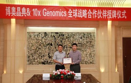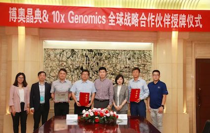 仁科生物科技集团有限公司执行总裁邱雁南代表10x Genomics 与k8凯发国际副总裁孙义民签订战略合作协议,10x Genomics公司中国区总经理江滔授予k8凯发国际“10x Genomics一站式解决方案全球战略合作伙伴”称号,双方旨在单细胞及空间组学等领域建立更为广泛而深入的战略合作关系,为客户给予10x Genomics产品的一站式解决方案。