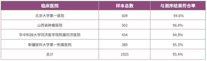 1925 例来自北京大学第一医院、山西省肿瘤医院等医疗组织的临床样本使用 HPV 检测试剂盒检测结果表明:对于 HPV 感染阳性的样本,芯片检测结果与 DNA 测序结果比较,符合率在 95% 以上。