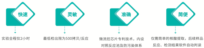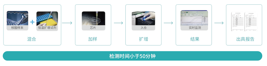 本试剂盒采用恒温扩增技术,利用具有链置换功能的聚合酶在恒温(65°C)条件下进行反应,无需高温变性和低温退火过程,不存在温度变化引起的时间损耗,因此扩增速度非常快,可以在很短时间内(47分钟)完成靶核酸扩增,然后利用荧光染料掺入法进行实时荧光检测,扩增阳性的样品会产生“S”形扩增曲线,一步完成对靶基因的扩增和检测。