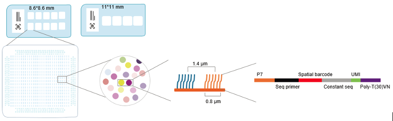 芯片包括两种类型:组织透化芯片和基因表达芯片,表达芯片捕获区域面积为11*11mm。在捕获区域内存在着数千万的探针簇,每个探针簇的直径为0.8 μm,每平方微米有约18000 条探针,用于捕获转录本(图1)。每条探针捕获序列由5 部分组成 :