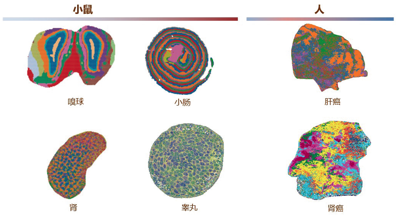 现在对人和小鼠的多种组织,包括嗅球、小肠、肾脏、肝等进行空间转录实验,绘制各种细胞类型在组织中的精细空间分布(图4)。